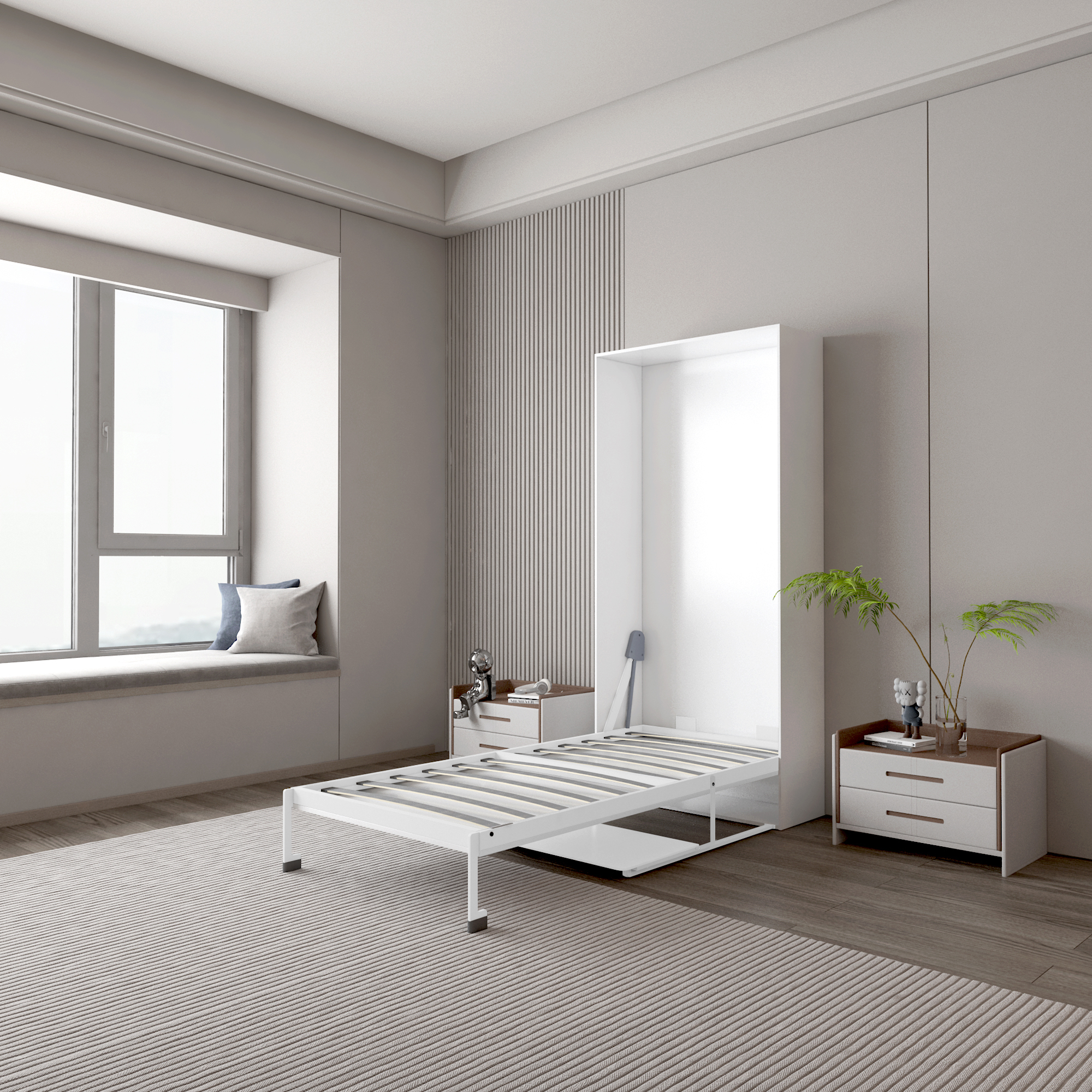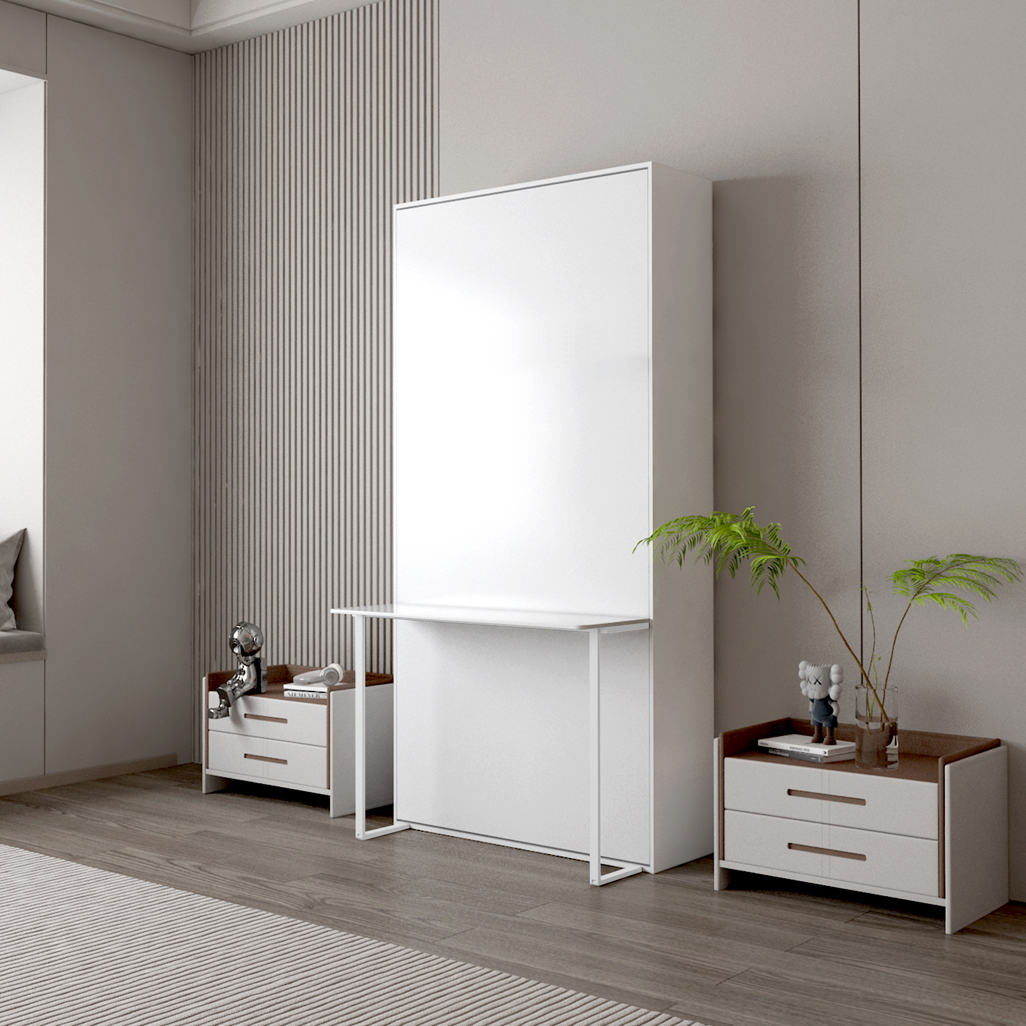 Optimize your space with our Super Single Size Vertical Murphy Bed With Table! This multifunctional design combines a comfortable super single-sized bed and a fold-out table, creating the perfect solution for small spaces, guest rooms, or home offices. The bed seamlessly folds up, revealing a spacious table ideal for work, dining, or crafts. With easy operation and a sleek, modern look, this Murphy bed is Best for small apartments/guest rooms where you need a desk by day and bed by night allowing you to transition from day to night effortlessly.